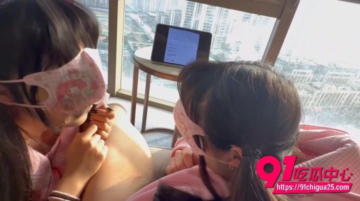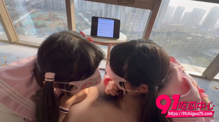 两个女孩戴着可爱粉色眼罩,趴在男人身上,一个握着鸡巴往嘴里含,另一个凑过来用舌头帮忙舔,配合得非常默契。