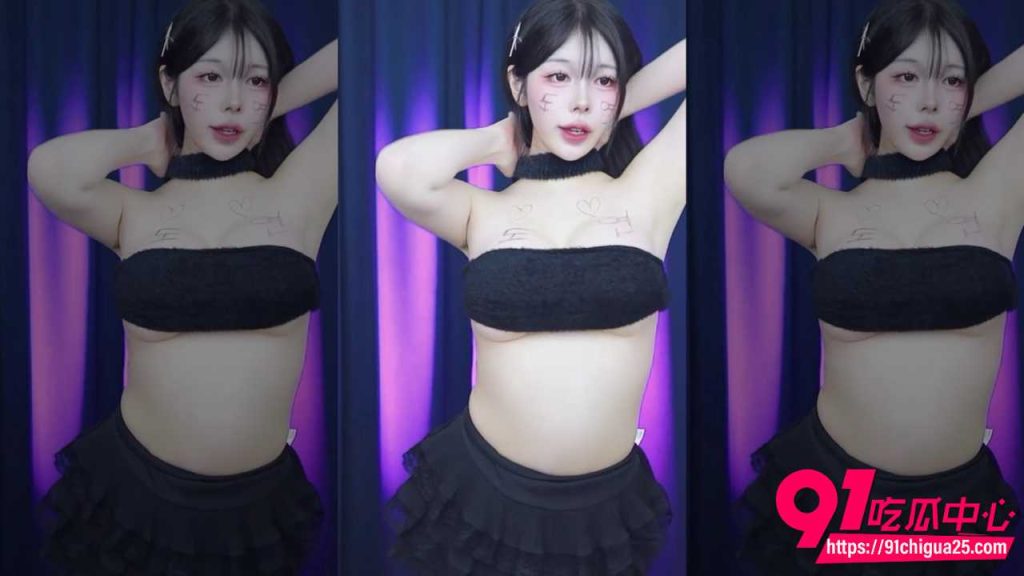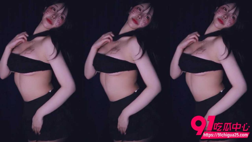 她换上黑色抹胸短裙,胸前和锁骨还是红笔画的心形和字母,腰部扭动,头发甩到一边,眼神妩媚看着镜头。